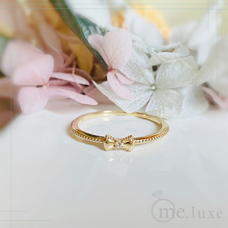 渾圓立體的蝴蝶結,設計在有穀粒做工的戒檯上,精緻有變化,蝴蝶結中間點綴一顆鑽石,明亮又有高級感