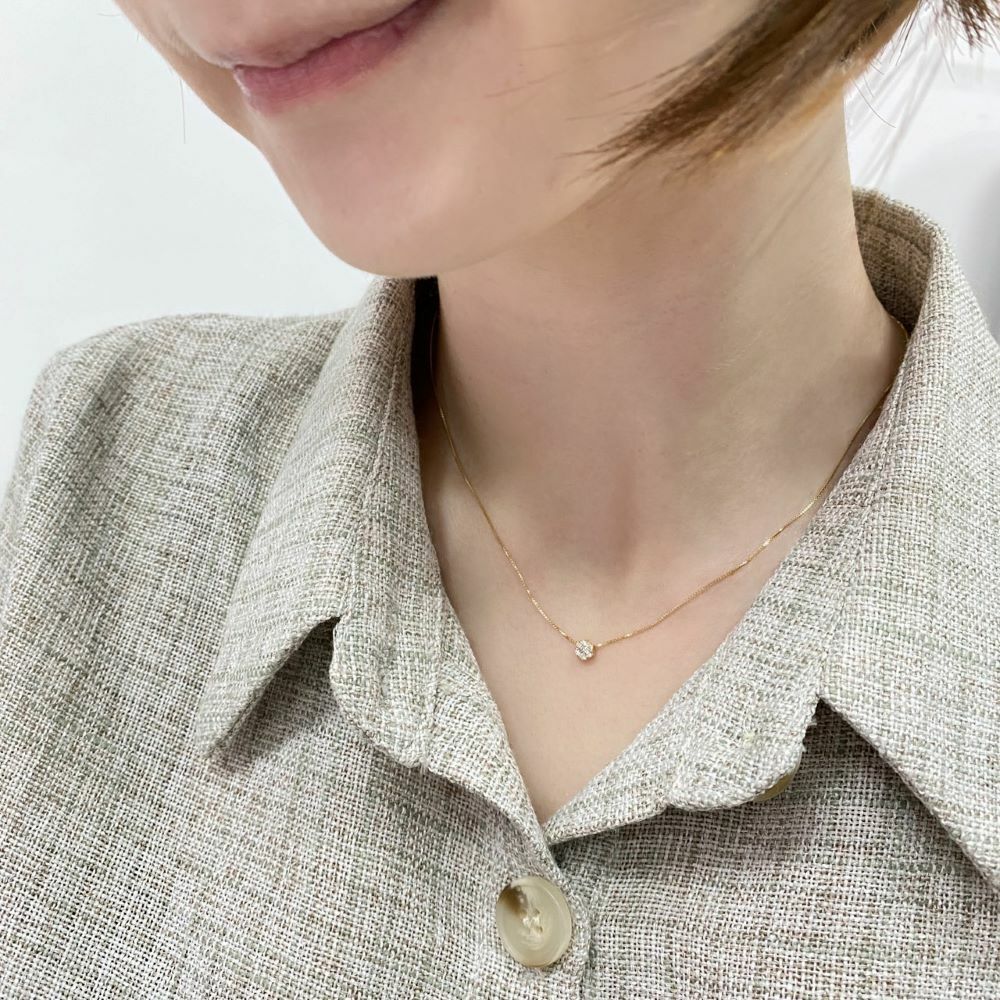 由7顆鑽石拼接成一朵花的造型,利用密釘鑲(Pavé setting)的工法,讓只有10分的項鍊卻有20分的視覺效果,20分鑽在視覺上也有著30分以上的效果,凸顯工法的細膩,配戴起來非常有份量感,單品配戴展現獨特經典之美,也能疊搭出多變時髦風格